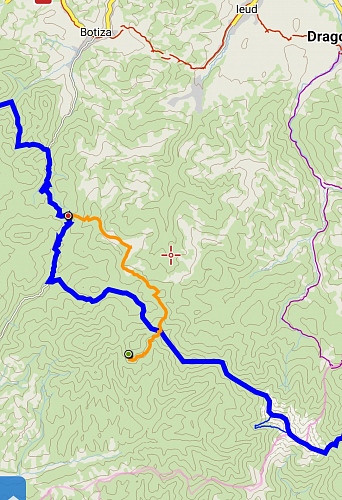 Modrá je trasa plánovaná z tepla domova, oranžová je trasa, kterou mi poslali rumunští značkaři a…