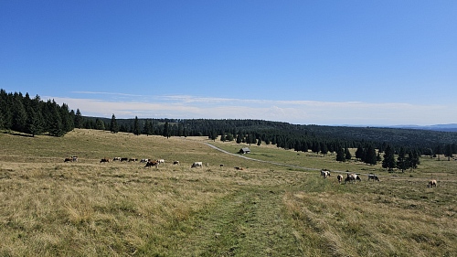 Převážně smrkové lesy střídají pastviny s dalekými výhledy. Směrem na východ jsou na horizontu…